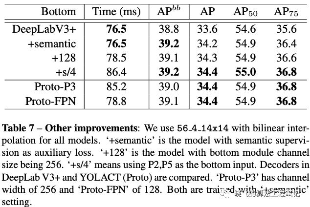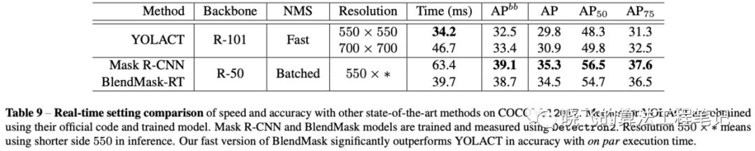 为了跟YOLACT对比,论文改造了一个紧凑版的BlendMask-RT: 1) 减少prediction head的卷积数 2) 合并classification tower和box tower 3) 使用Proto-FPN并去掉P7。从结果来看,BlendMask-RT比YOLACT快7ms且高3.3AP。