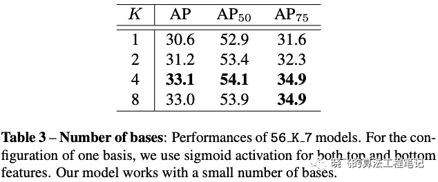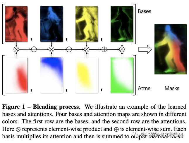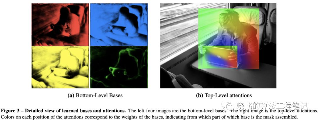 红蓝两个基底分别检测了目标的右上和左下部分点,黄色基底则检测了大概率在目标上的点(semantic mask),而绿色基底则激活了物体的边界,position-sensitive features有助于进行实例级别的分割,而semantic mask则可以对postion-sensitive进行补充,让最后的结果更加顺滑。由于学习到了更多准确的特征,BlendMask使用了比YOLACT和FCIS少很多的基底纬度(4 vs. 32 vs. 49)。