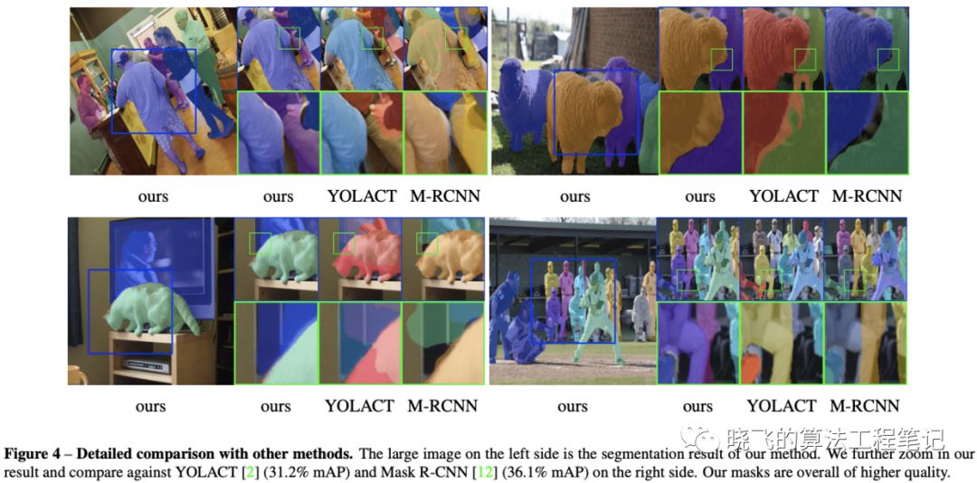 图4展示了可视化的结果,可以看到BlendMask的效果比Mask R-CNN要好,因为BlendMask的mask分辨为56而Mask R-CNN的只有28,另外YOLACT是难以区分相邻实例的,而BlendMask则没有这个问题。