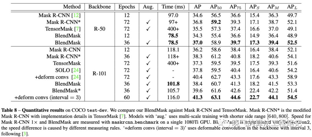 BlendMask的另一个优点是产生了高质量的mask,而分辨率输出是不受top-level采样限制。对于Mask R-CNN增大分辨率,会增加head的计算时间,而且需要增加head的深度来提取准确的mask特征 。另外Mask R-CNN的推理时间会随着bbox的数量增加而增加,这对实时计算是不友好的 最后,blender模块是十分灵活的,因为top-level的实例attention预测只有一个卷积层,对于加到其它检测算法中几乎是无花费的。