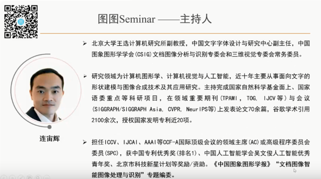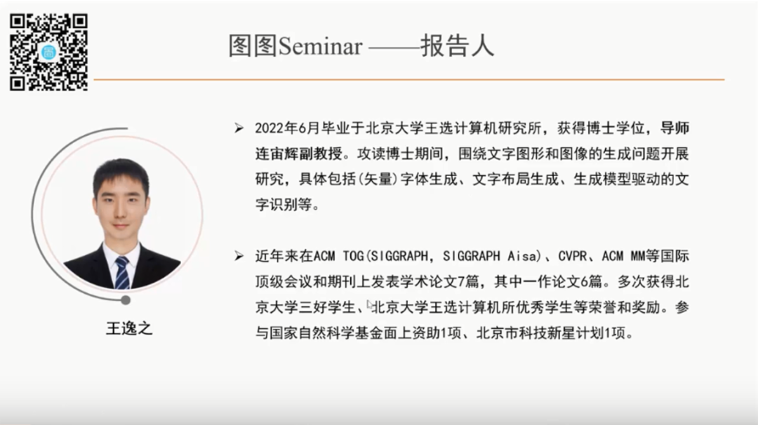 CSIG文档图像分析与识别专业委员会学术微沙龙(简称:文档图像微沙龙)在线学术报告会第十期于2022年7月5日成功举行。本沙龙由中国图象图形学学会主办,文档图像分析与识别专委会发起承办,中国图象图形学报协办。本期活动邀请北京大学王逸之博士分享报告: 面向文字的图形图像生成方法及其应用。微沙龙活动在B站、蔻享学术,中国图像图形学报视频号进行了同步直播。