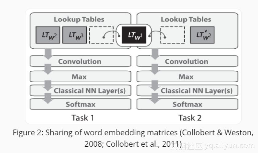 共享词嵌入使模型能够在词嵌入矩阵中协作和共享一般的低级信息,这通常构成模型中最大数量的参数。Collobert和Weston在2008年的论文中证明了它在多任务学习中的应用,它引领了诸如预训练词嵌入和使用卷积神经网络(CNN)之类的思想,这些思想仅在过去几年中被广泛采用。它赢得了ICML 2018的时间考验奖(参见此时的时间考验奖论文)。