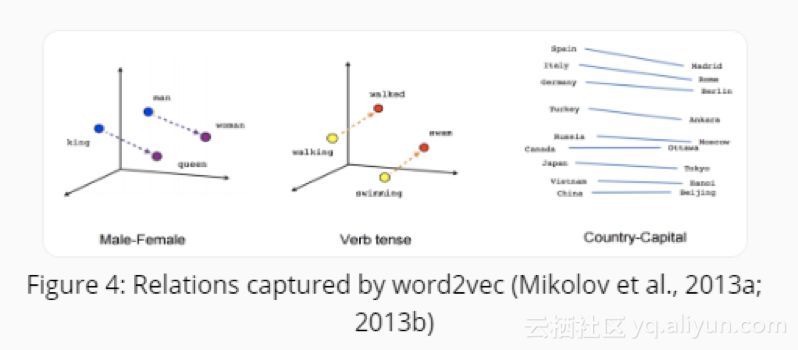 虽然这些嵌入在概念上与使用前馈神经网络学习的嵌入技术没有什么不同,但是对非常大的语料库的训练使它们能够捕获诸如性别,动词时态和国家–首都关系之类的词之间的某些关系,由图4可知: