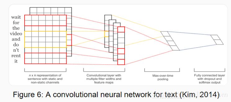 随着卷积神经网络(CNN)被广泛用于计算机视觉,它们也开始应用于文本(Kalchbrenner等,2014; Kim等,2014)。用于文本的卷积神经网络仅在两个维度上操作,其中滤波器仅需要沿时间维度移动。下面的图6显示了NLP中使用的典型CNN。