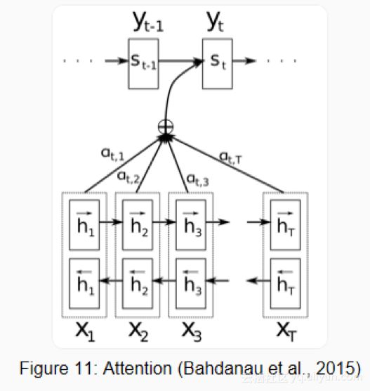注意力(Bahdanau等,2015)NMT)的核心创新之一,也是使NMT模型优于基于经典短语的MT系统的关键思想。序列到序列学习的主要瓶颈是它需要将源序列的整个内容压缩成固定大小的矢量。注意力通过允许解码器回顾源序列隐藏状态来减轻这种情况,然后将其作为加权平均值提供给解码器的附加输入,如下面的图11所示。