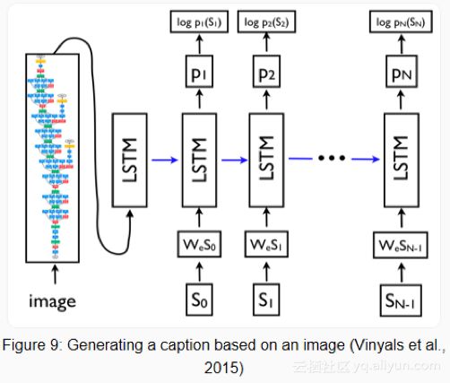 由于其灵活性,该框架现在是自然语言生成任务的首选框架,不同的模型承担编码器和解码器的角色。重要的是,解码器模型不仅可以以序列为条件,而且可以以任意表示为条件。这使得例如基于图像生成标题(Vinyals等人,2015)(如下面的图9中可见),基于表格的文本(Lebret等人,2016),以及基于源代码更改的描述(Loyola等,2017),以及许多其他应用程序。