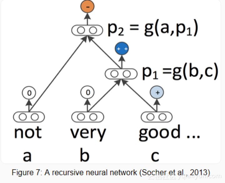 RNN和CNN都将语言视为一个序列。然而,从语言学的角度来看,语言本质上是等级的:单词被组成高阶短语和子句它们本身可以根据一组生产规则递归地组合。将句子视为树而不是序列的语言启发思想产生了递归神经网络,这可以在下面的图7中看到: