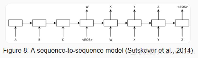 2014年,Sutskever等人提出序列到序列学习,一种通过神经网络将一个序列映射到另一个序列的通用框架。在该框架中,编码器神经网络逐个符号地处理句子并将其压缩成矢量表示; 然后,解码器神经网络基于编码器状态逐个符号地预测输出符号,在每个步骤中将先前预测的符号作为输入,如下面的图8所示。