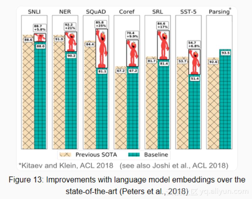 预训练的词嵌入与上下文无关,而且仅用于初始化模型中的第一层。最近几个月,一系列监督任务被用于预训练神经网络(Conneau等,2017; McCann等,2017; Subramanian等,2018)。相比之下,语言模型只需要未标记的文本; 因此,训练可以扩展到数十亿个tokens,新领域和新语言。 2015年首次提出了预训练语言模型(Dai&Le,2015); 直到最近,它们才被证明对各种各样的任务都有益。 语言模型嵌入可以用作目标模型中的特征(Peters等,2018),或者可以对目标任务数据微调语言模型(Ramachandran等,2017; Howard&Ruder,2018)。添加语言模型嵌入比许多任务的最新技术有了很大的改进,如下面的图13所示。