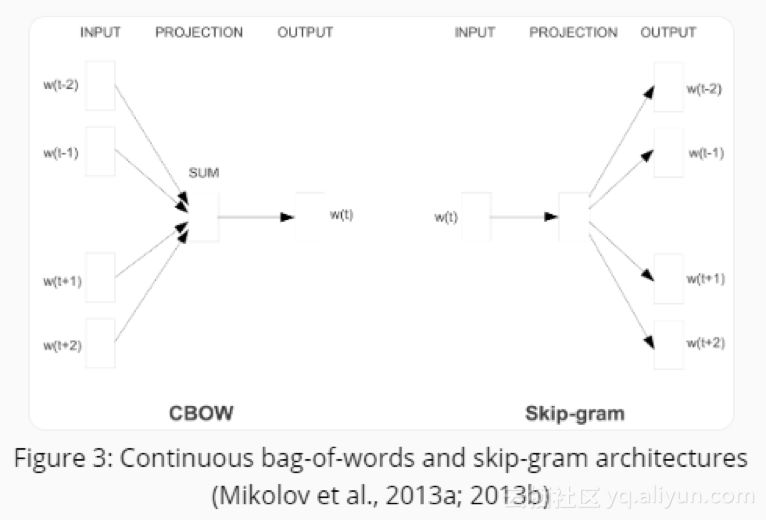 Word2vec有两种模式,可以在下面的图3中看到:连续的词袋(CBOW)和skip-gram。它们的目标不同:一个基于周围的词预测中心词,而另一个则相反。