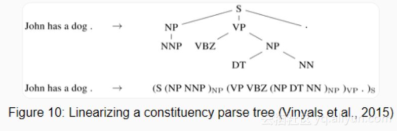 序列到序列学习甚至可以应用于NLP中常见的结构化预测任务,其中NLP输出具有特定结构。简单地说,输出是线性化的,如下面图10中的consituency解析所示。神经网络已经证明了在给予consituency解析的足够数量的训练数据(Vinyals等,2015)和命名实体识别(Gillick等,2016)等的情况下,能够直接学习产生这种线性化输出的能力。