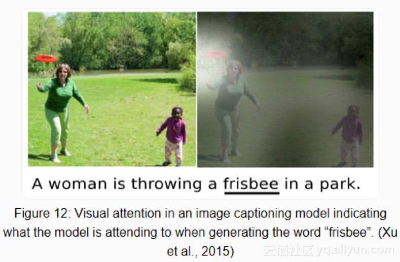 注意力有不同的形式(Luong等,2015)在这里查看简要概述。 注意力广泛适用并且可能对任何需要根据输入的某些部分做出决策的任务有用。它已被应用于consituency解析(Vinyals等,2015),阅读理解(Hermann等,2015)和一次性学习(Vinyals等,2016)等。甚至输入不需要是序列,但可以包括其他表示,如图像字幕的情况(Xu et al.,2015),可以在下面的图12中看到。注意力的一个有用的副作用是,通过根据注意力量检查输入的哪些部分与特定输出相关。