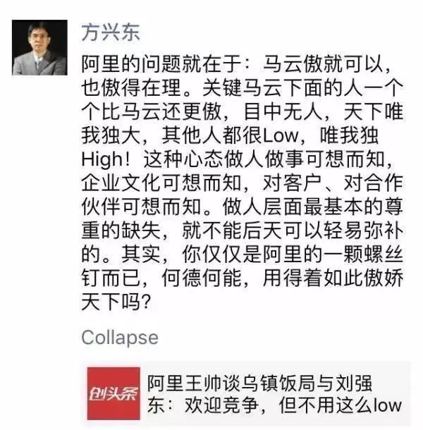 2017年12月,阿里巴巴公关委员会主席王帅在湖畔大学回答学员提问时阐述的关于京东、阿里的那些事后,方兴东发布了一条疑似回应王帅的朋友圈阐述了自己的观点。他表示,阿里的问题就在于马云傲,同时马云的下属一个个比马云更傲,“目中无人,天下唯我独大,其他人都很low,唯我独high!”