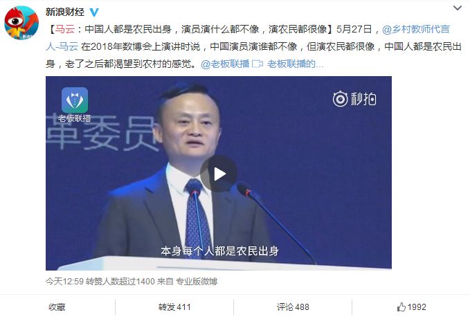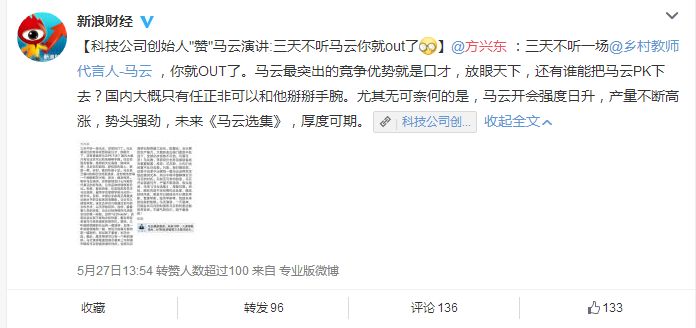 爱刷微博的人一定对马云的演讲有着深刻的印象。隔三差五就能刷到他的众多演讲以及分割后的众多观点。比如今天,挨踢妹就刷了至少三条以上。