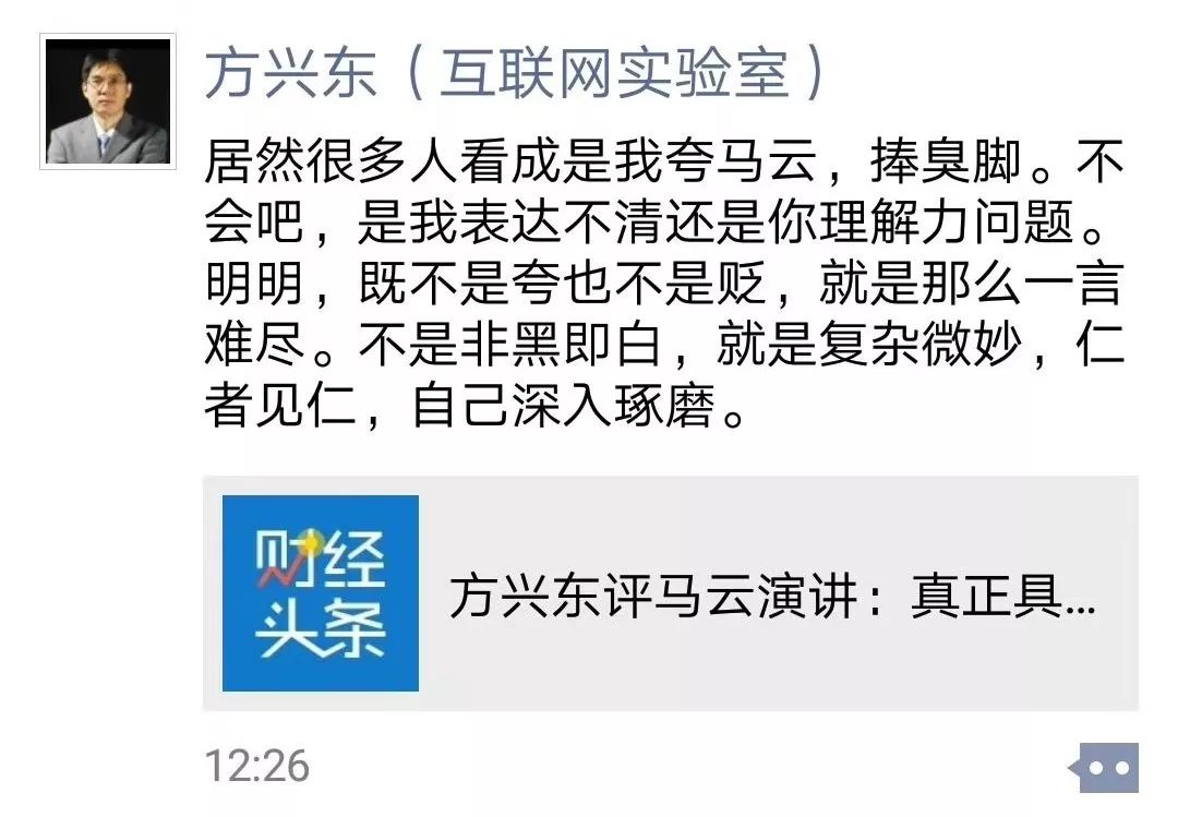 不过,方兴东的观点十分有意思,他咋看之下,似乎是在夸马云。比如说,目前,中国企业家真正具备演出级水平的企业家凤毛麟角,马云可以孤独求败。马云已经网络时代顶级会议的第一标配,没有“马云Inside“,说明这会议就不够档次和份量。 马云的演讲已经能大踏步走出国门,库克、贝左斯、小扎们也成为他衬托……