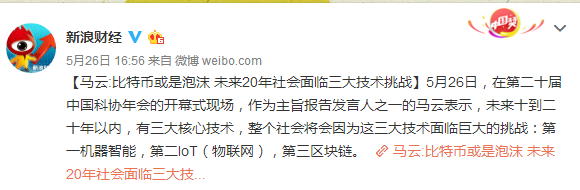 他点评的正是观点中的第三条:第二十届中国科协年会开幕式马云发表的题为《因为相信,所以看见》的演讲。在此次由中国科协和浙江省人民政府联合主办,重科技、偏学术的会议上,马云出席开幕式并发表演讲。马云认为,未来10-20年以内,将有三大技术让人类面临挑战:机器智能、IoT和区块链。对于区块链,马云认为区块链不是泡沫,但今天的比特币可能是泡沫。