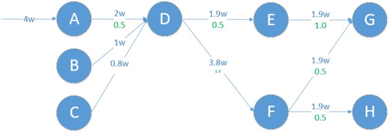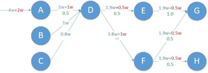 图中绿色数字代表传导系数,比如 A 到 D 的传导系数是 0.5。 因为 A 被请求 4w 次每秒,A 就会主动调用 D 服务 2 万次每秒。 有了拓扑图和传导系数,那么就能很容易的根据入口评估出后续服务的请求增量。如图 13, 假如 A 的请求增加 2 万 / 秒的请求量。 那么后续服务将会增加红色字体所描述的请求增量, 见图 14。