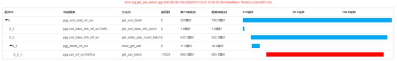 故障定位:天机阁利用跟踪数据,可以还原调用链,再结合日志数据,可以快速实现故障定位。例如:用户投诉他的视频点赞数不对,开发同学可以根据用户 qq 号码找到投诉用户的请求 trace。 查看 trace 详情就能很清楚的看到该请求在获取点赞结果的时候超时了,开发同学可以迅速完成定位并处理。Ui 界面见图 3。