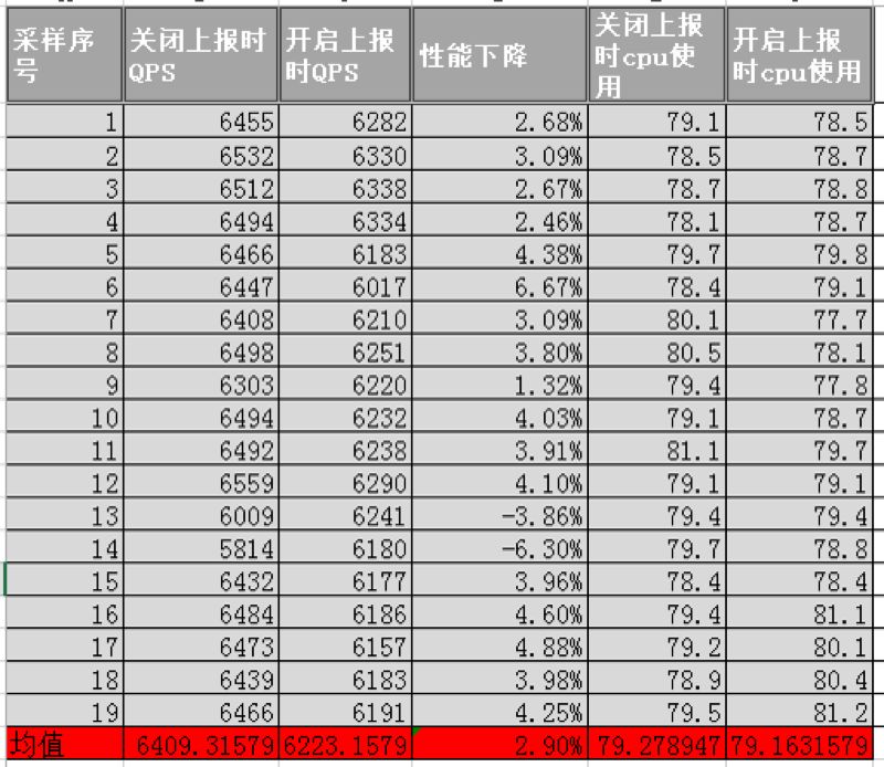 性能损失验证:开启天机阁上报后,实测 qps 下降低于 3%。测试 server 的逻辑是 读取 cmem 小数据 (大约几个字节) 返回,比较简单的操作。在 cpu 消耗差不多的情况下,qps 下降 2.9% 左右,详细数据见下表。如果业务逻辑更复杂,这个操作的消耗占比会更低,性能损耗会更不明显。