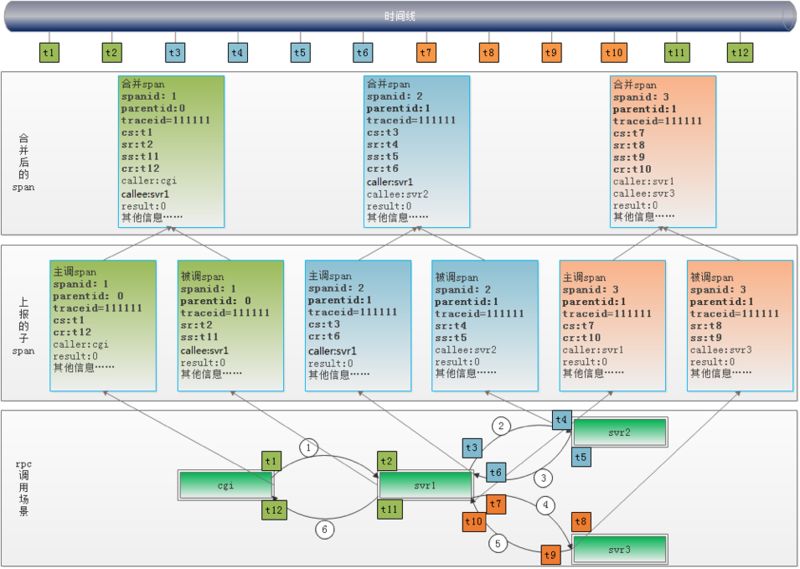 第 1 个子 span:cgi 在发起 rpc 前,生成一个 client span, traceId=111111, spanid=1, parented=0(没有父 span)。并将这 3 个 ID 通过带内数据的方式传递给 svr1。等 cgi 收到 svr1 的回包后,补全 span 的事件时间:cs=t1, cr=t12,并上报主调 span。见图 8 中 cgi 上报的“主调 span”。