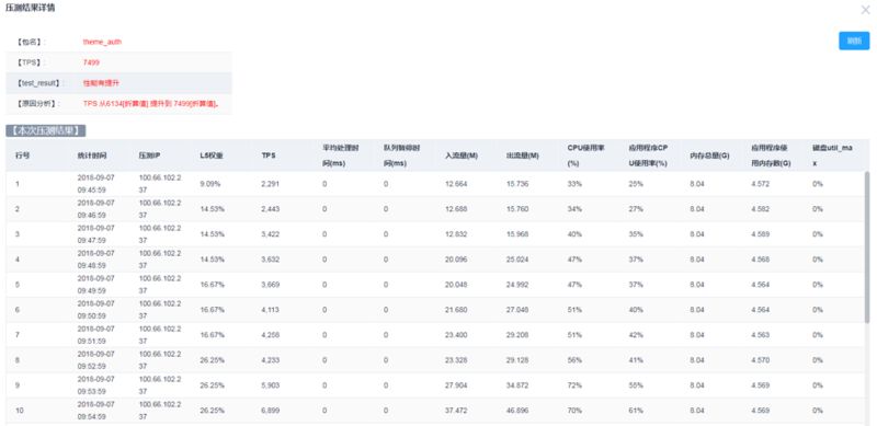 天机阁的压测系统导现网流量进行压测,不需要开发构造请求,仅需要点击个启动按钮,就能自动完成压测,并生成详细的压测报告。报告包括压测结果详情(图16),性能趋势图(图17),压测结果环比(图 18),以及其他的一些性能指标。