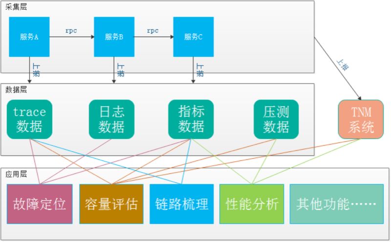天机阁是一个以分布式链路跟踪为核心的监控系统。它通过采集、存储、分析分布式系统中的“trace 数据”、“指标数据”和“日志数据”,再结合压测数据和 TNM2 数据,实现故障诊断、容量评估以及系统梳理等多种功能,大大降低开发人员的运维挑战, 见图 2。详细数据采集过程见下文“数据采集”部分。