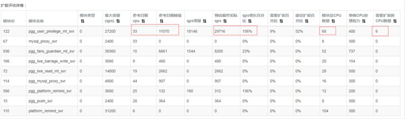“企鹅电竞”是接入天机阁的第一个业务。 企鹅电竞有一个关键指标 PCU——同时观看直播的用户数。 企鹅电竞的大部分服务请求量跟 pcu 数据正相关。天机阁为企鹅电竞专门开发了基于 pcu 的容量评估模型。图 5 是天机阁基于 pcu 的容量评估结果。