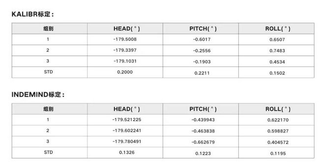 INDEMIND双目惯性模组采用的标定方法是其自行设计的,与开源Kalibr标定相比,相机与IMU间的安装角误差重复性精度提升1.5倍,相机重投影误差降低0.04个像素(平均值)。