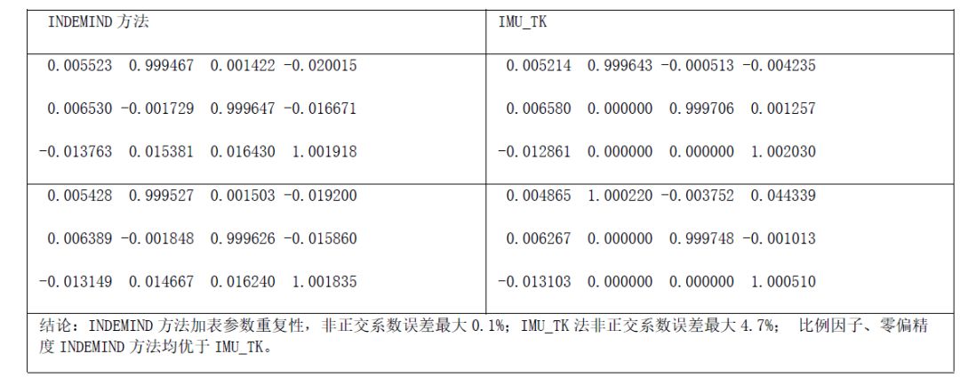 与IMU_TK对比,INDEMIND标定的加速度计和陀螺仪在零偏、比例因子及正交误差参数方面均有明显提升,通过加速度计参数重复性,加速度计静态测量结果与重力绝对偏差,陀螺参数重复性、静态陀螺零偏偏差、动态陀螺旋转位置角度等方面验证了标定结果均优于IMU tk方法。