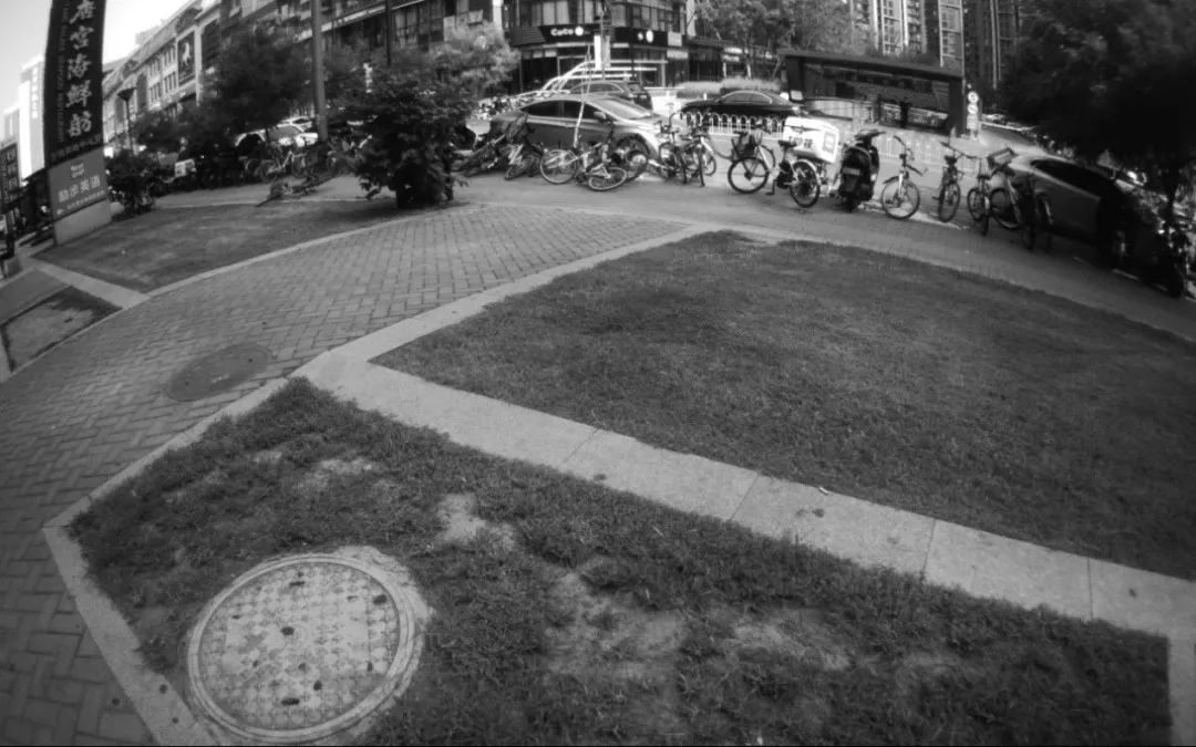 室外强光环境,双目惯性模组曝光精准,高光处黑色轿车及广告牌轮廓清晰;暗部细节保留明显,基本无噪点(详见上图左上角),并且窨井盖周围的杂草处保留了更多细节,边缘清晰。