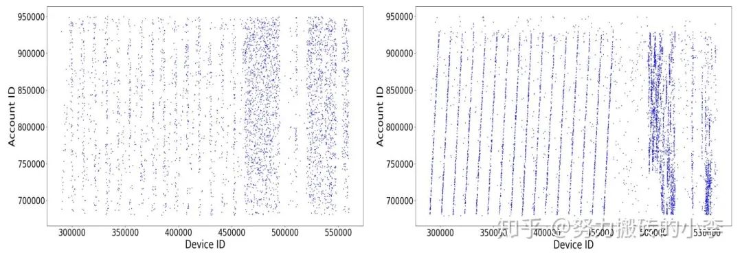 对数据进行分析发现,异常用户往往会有设备聚集性,如果在一个设备上常常会登录大量用户,那么这个设备以及这些账号通常是可疑的。如图所示为正常用户与异常用户的设备-账号id分布,横坐标为设备id,纵坐标为账号id,左图为正常用户,右图为异常用户,可以看出异常用户在某些特定设备id上有较明显的群聚效应。