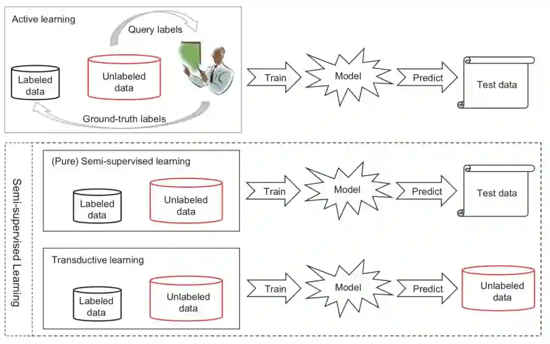 图 2:主动学习、(纯)半监督学习和直推式学习