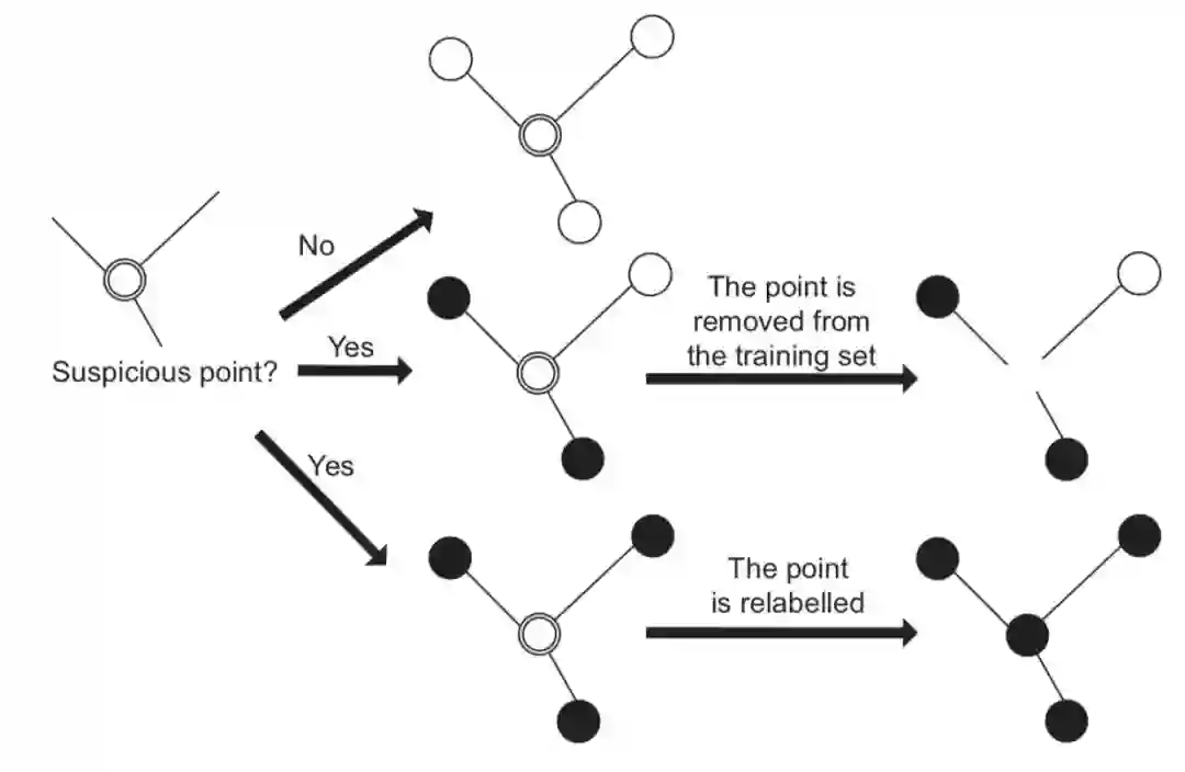 一个典型的场景是在有标签噪声的情况下进行学习 [68]。目前已有很多理论研究 [69-71],其中大多数假定存在随机的分类噪声,即标签受随机噪声影响。在实践中,基本的思想是识别潜在的误分类样本 [72],然后尝试进行修正。例如,数据编辑(data-editing)方法 [73] 构建了相对邻域图(relative neighborhood graph),其中每一个节点对应一个训练样本,而连接两个不同标签的节点的边被称为切边(cut edge)。然后,测量 一个切边的权重统计量,直觉上,如果一个示例连接了太多的切边,则该示例是可疑的。可疑的示例要么被删除,要么被重新标记,如图 6 所示。值得注意的是,这种方法通常依赖于咨询邻域信息;由于当数据很稀疏时,邻域识别将变得更不可靠,因此,在高维特征空间中该方法的可靠性将变弱。