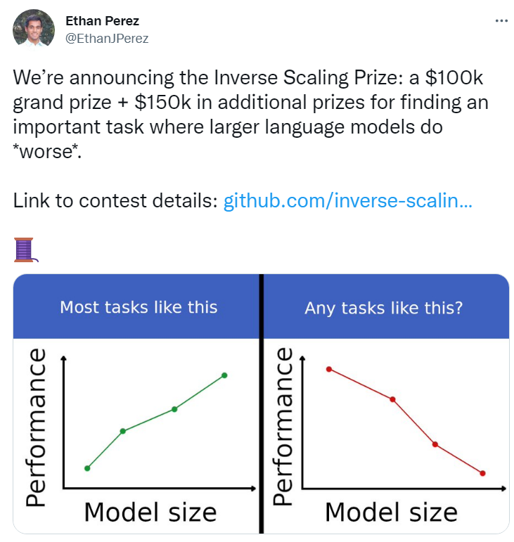 但正如上期报道的前谷歌员工离开 Google AI 后质疑的那样,海量资源无脑砸出的大模型真的会一直那么香吗? 目前一群来自 NYU 的研究员甚至在全网公开发起百万悬赏,征集大模型反规模效应的案例 (Inverse Scaling Prize) [1] !