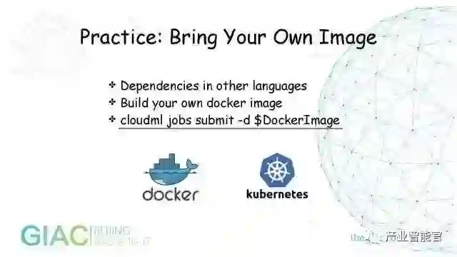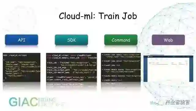 最上层是用户业务,有广告、搜索、游戏等,都有自己的业务场景,可以根据自己的数据格式编写一些Tensorflow、深度学习的脚本。通过Cloud-Ml的API把任务提交到服务端,由服务端创建一个容器,把它调用到真正的物理机计算资源上。