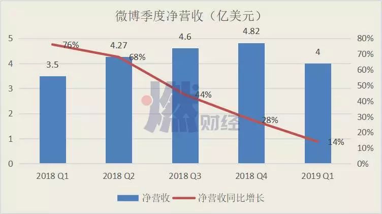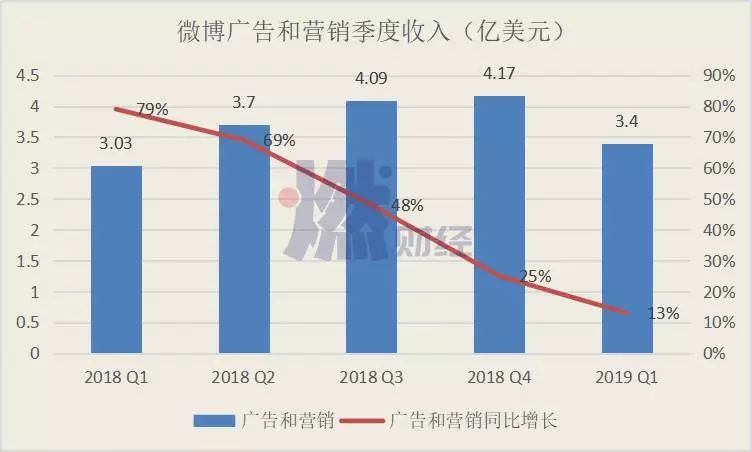一位社交行业分析师对燃财经表示,月活跃用户规模和使用时长是衡量媒体平台广告价值的重要依据。微博月活增速连续5季度持续下降,截至2019年Q1,微博的月活跃用户同比增速下降至13%,创历史新低。