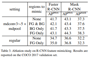 Table3是在COCO 2017 val数据集上关于RCNN feature mimicking是否有效的对比实验,可以看到在DCNv2的基础上增加foreground的IoU进行联合训练提升非常明显,而在常规卷积网络中(regular)的提升非常少,这也说明了仅有监督信息还是不够的,还需要modulation和offset扮演执行者角色进行实际操作。