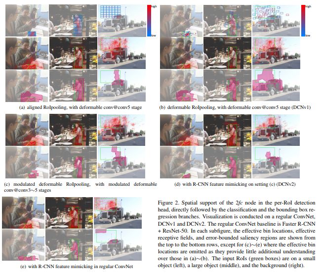 Figure2是关于常规卷积、DCNv1和DCNv2的对比图,用来说明Deformable RoI pooling的效果。