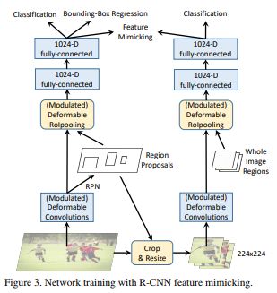 接下来看看训练阶段增加RCNN feature mimicking是如何实现的,示意图如Figure3所示,姑且称左边的网络为主网络(Faster RCNN),右边的网络为子网络(RCNN)。实现上大致是用主网络训练过程中得到的RoI去裁剪原图,然后将裁剪到的图resize到224×224大小作为子网络的输入,子网络通过RCNN算法提取特征,最终提取到14×14大小的特征图,此时再结合IoU(此时的IoU就是一整个输入图区域,也就是224×224)作为modulated deformable RoI pooling层的输入得到IoU特征,最后通过2个fc层得到1024维特征,这部分特征和主网络输出的1024维特征作为feature mimicking loss的输入,用来约束这2个特征的差异,同时子网络通过一个分类损失进行监督学习,因为并不需要回归坐标,所以没有回归损失。在inference阶段仅有主网络部分,因此这个操作不会在inference阶段增加计算成本。