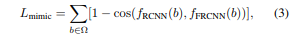 feature mimicking loss采用cosine函数度量2个输入之间的差异,这是利用了cosine函数能够度量两个向量之间的角度的特性,其中fRCNN(b)表示子网络输出的1024维特征,fFRCNN(b)表示主网络输出的1024维特征,通过对多个RoI的损失进行求和就得到Lmimic。