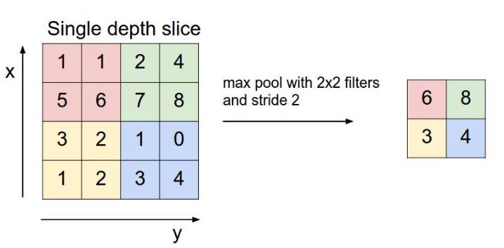 让我们以最大池化为例。在这种情况下,我们定义了一个空间窗口(spatial window),并从其中的特征映射获取最大元素,现在记住图 2(卷积是如何工作的)。直观来讲带有更大步长的卷积层可作为子采样和下采样层,从而使输入表征更小更可控。同样它也可减少网络中的参数数量和计算,进而控制过拟合的发生。