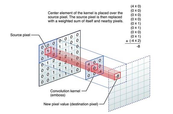 卷积是如何进行的。每一个像素由周围像素的加权和所替代,神经网络会学习这些权重。