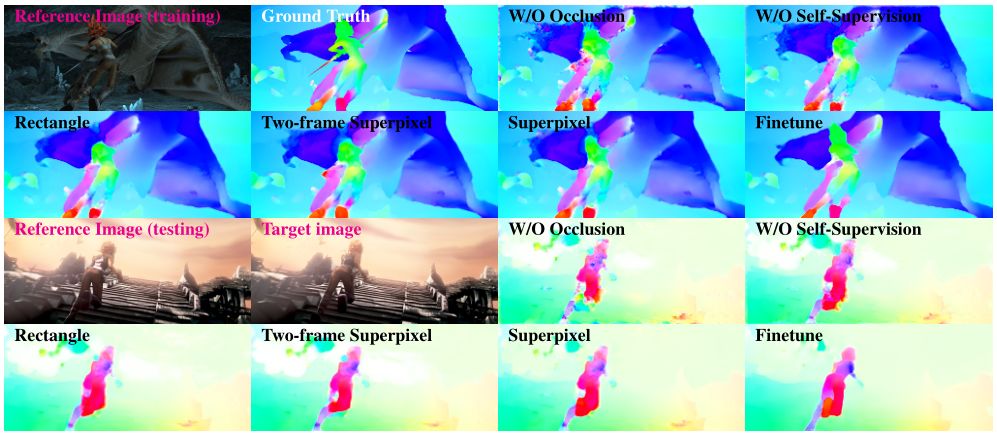 图5 在Sintel Clean培训和Sintel Final测试数据集的不同设置下的定性比较。遮挡处理,多帧制定和自我监督不断提高性能