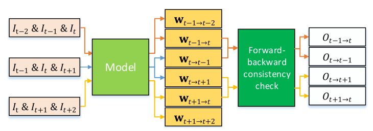 图3 多帧自训练的数据流。为了估计三帧流学习的遮挡图,我们使用五个图像作为输入。这样,我们可以进行前后一致性检查,以分别估计I t和I t + 1之间,I t和I t-1之间的遮挡图。