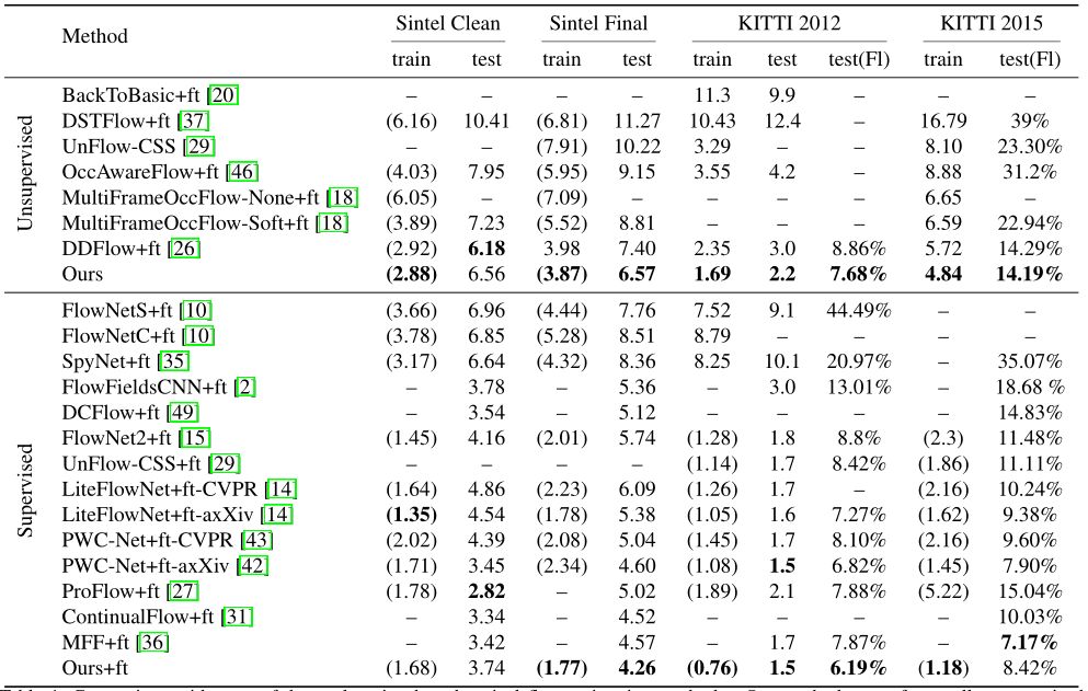 表1:与基于最先进学习的光流估计方法的比较。我们的方法优于所有数据集上的所有无监督光流学习方法。我们的监督微调模型在Sintel Final数据集和KITTI 2012数据集上实现了最高精度。除KITTI 2012和KITTI 2015测试集的最后一列外,所有数字均为EPE,我们报告了所有像素(Fl-all)上的错误像素百分比。( - )表示未报告相应方法的结果。括号表示训练和测试是在同一数据集上执行的。粗体字为无监督和监督方法中的最佳结果。