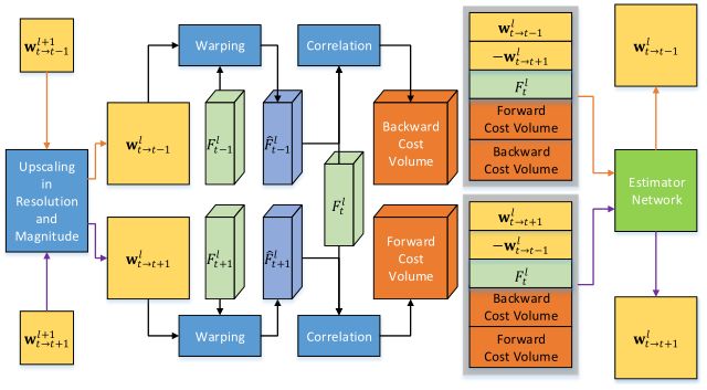 图2 在每个级别的网络架构(类似于PWC-Net)。˙wl表示水平l的初始粗流,F l表示翘曲的特征表示。在每个级别,将初始流量和成本量作为输入交换,以便同时估计前向流量和后向流量。再将这些估计传递到l-1层上,估计更高分辨率的流。