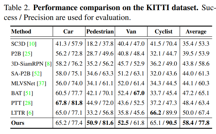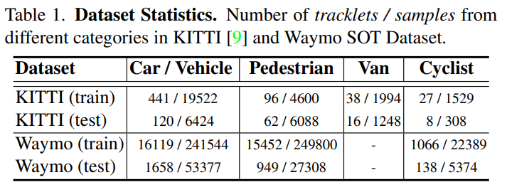 除了方法上的贡献,我们还提出了一个基于Waymo Open Dataset新的大规模点云跟踪数据集。由于Waymo中对于每个目标都标注了对应的ID,因此可以提取出某个ID在不同时刻的位置信息,基于此,我们制作了Waymo的单目标跟踪数据集,如下表所示,我们制作的Waymo跟踪数据集在数据量上远远超过了KITTI,为学术界在大数据集上进一步的研究提供了一个baseline。
