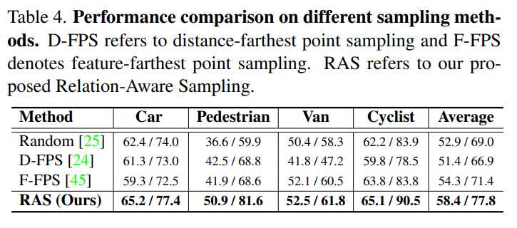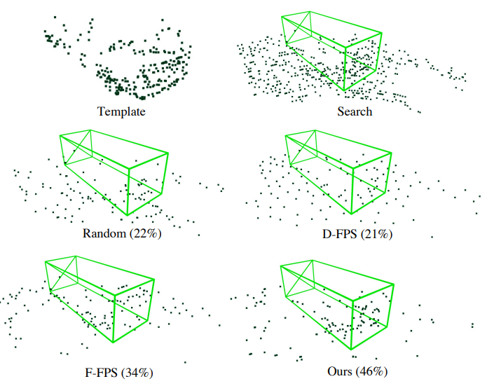 点云的稀疏性是跟踪算法的一大挑战,而点云的特征提取通常伴随着下采样的过程。现有跟踪算法大多采用随机采样的方式,会在采样过程中在搜索区域丢掉大量的前景点,不利于后续的特征匹配。所以我们提出语义感知采样,利用模板和搜索区域的特征距离进行采样。由于模板区域大多数由目标物体上的点云组成,因此我们在搜索区域采样那些特征距离和模板尽可能小的点,就能尽可能地得到更多的前景点。如下图所示,我们对比了不同的采样方法,采样得到的点中位于3维目标框中的比例,可以明显地看到我们提出的RAS最大程度地得到了前景点。