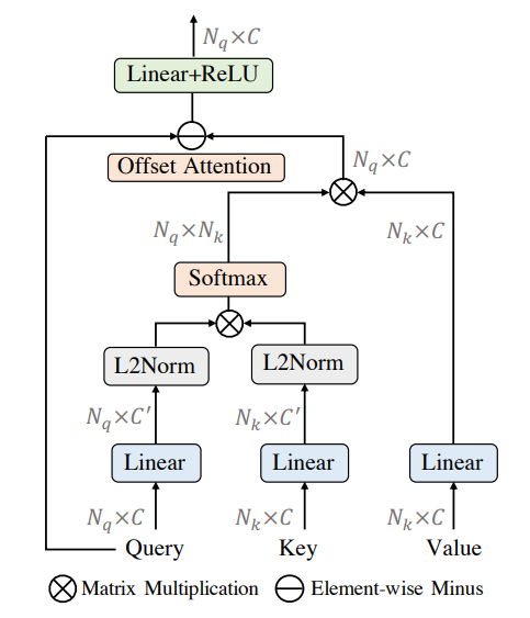 在跟踪问题中,我们需要匹配模板和搜索区域的点,大多数已有的3D单目标跟踪算法采用了特征的余弦距离,认为余弦距离小的点匹配程度高。与此不同的是,我们基于注意力机制在计算机视觉中的成功应用,设计了基于关系的注意力机制,来匹配模板和搜索区域的点云。如下图所示,我们设计的注意力模块利用了offset-attention,将query,key,value特征进行融合,并通过激活层引入非线性。具体来说,我们先通过一个self-attention模块来分别处理模板和搜索区域点云,接着我们将搜索区域点云作为query,模板区域点云作为key和value,输入到一个cross-attention,就得到了匹配之后的搜索区域点云特征。