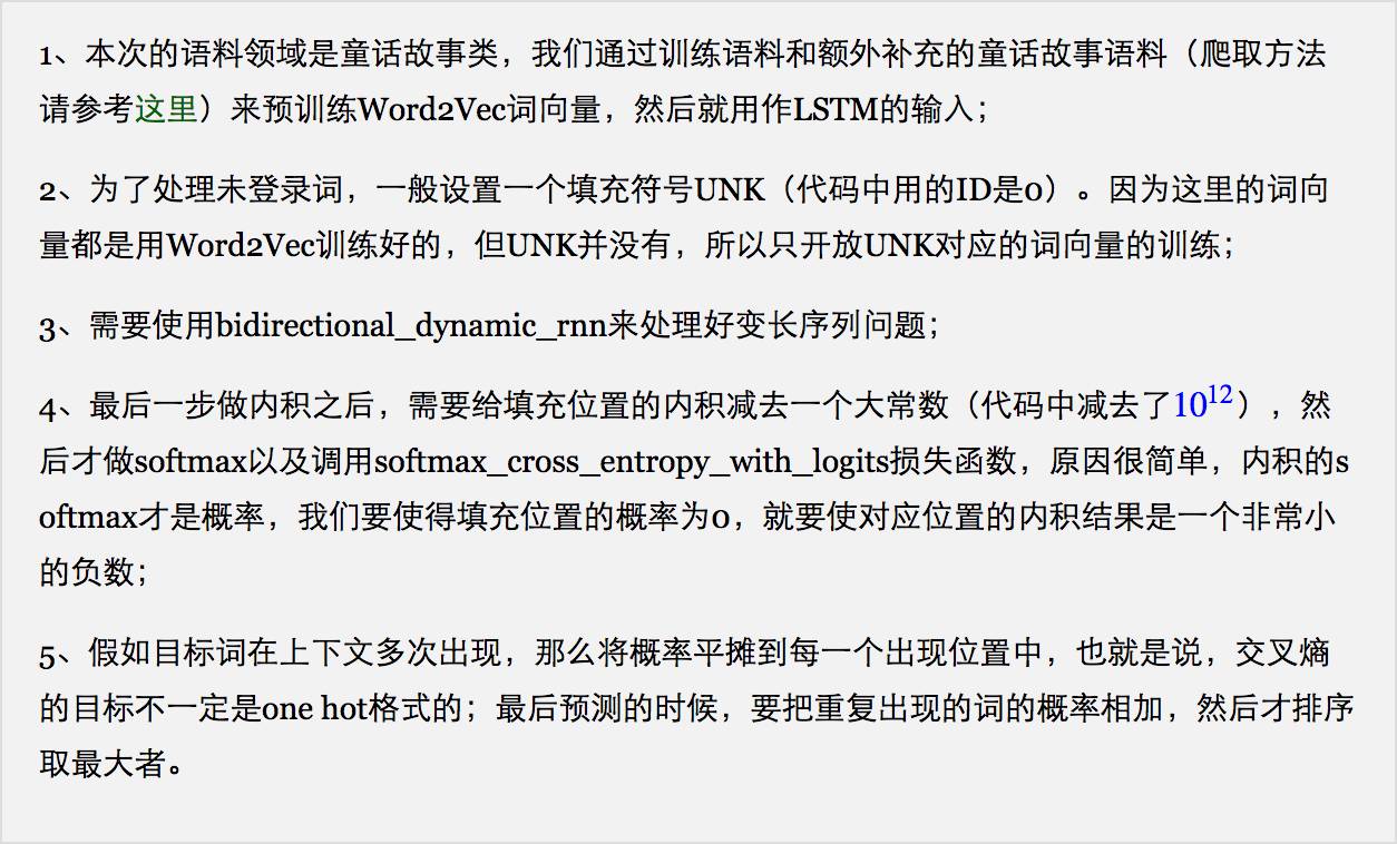 也就是说,特征与词做配对,是通过内积来实现的。这就提供了参考思路:如果我们让 LSTM 输出的特征与词向量维度一样大,然后将这个特征与输入的词向量一一做内积(配对),然后就可以做 softmax 了,这样就实现了只在上下文搜索。